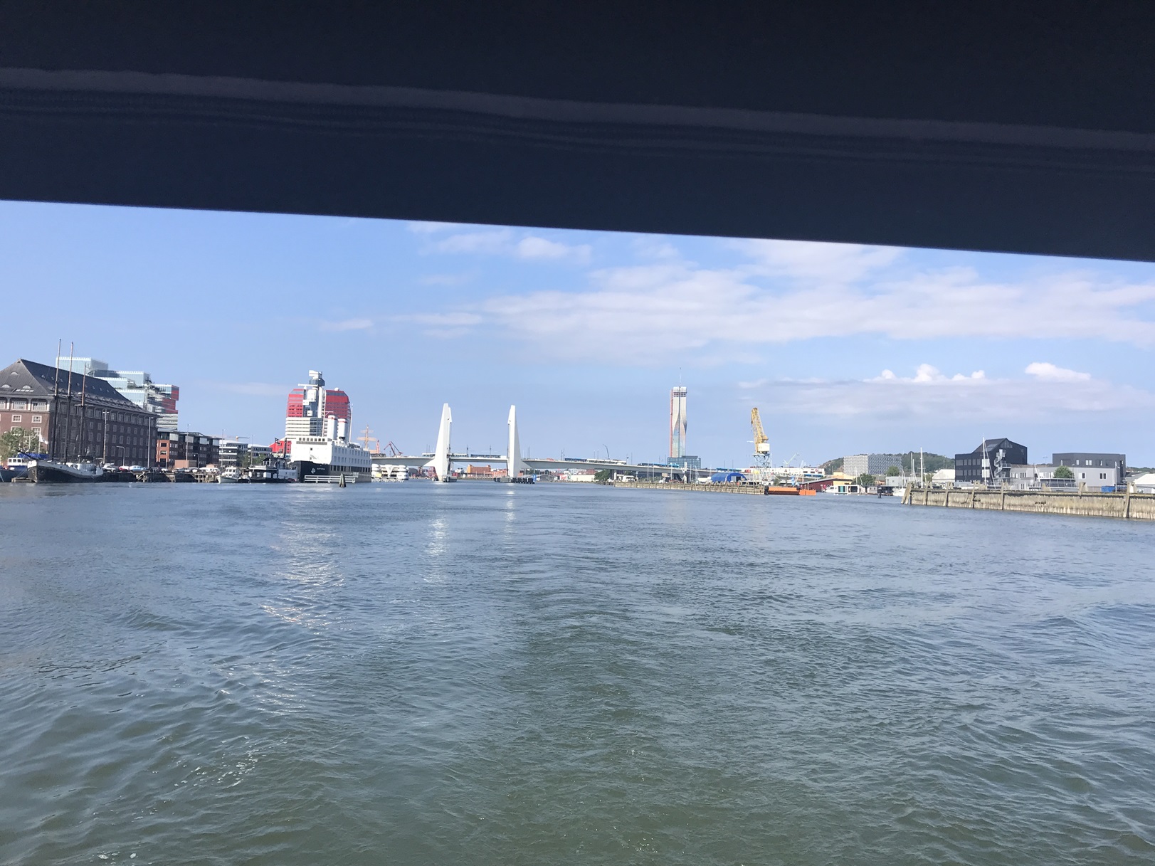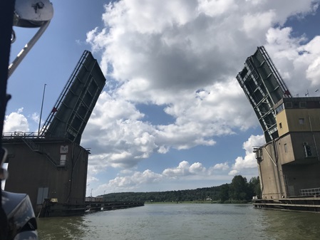 Glücklicherweise hatten wir Prospekte von dem Kanal mit zwei Telefonnummern. Ich rief bei beiden an und bekam die Auskunft, dass sowohl die eine, als auch die andere Nummer nicht vergeben ist!??! Nach längeren Recherchen im Netz fand ich noch eine dritte Telefonnummer, wahrscheinlich die der übergeordneten Revierzentrale. Dort meldete sich tatsächlich jemand. Der sagte aber er wäre nicht zuständig, ich solle die Baufirma anrufen. Die Nummer oder nen Namen hatte er nicht. Toll. Ich fragte ihn, ob ein Frachter demnächst in Richtung Brücke unterwegs sei, und da gab es einen Hoffnungsschimmer. "Ja, in ca. 2 Stunden kommt einer. " Nicht das, was ich erhofft hatte, aber wenigstens eine Lösung. Ich machte es mir gerade an meinem Rechner bequem und wollte Emails beantworten, da geschah ein Wunder. Zufällig war meine Crew draußen und rief: "Die Brücke geht auf!" Ich habe noch nie so schnell den Motor gestartet und abgelegt. Nix wie weg.