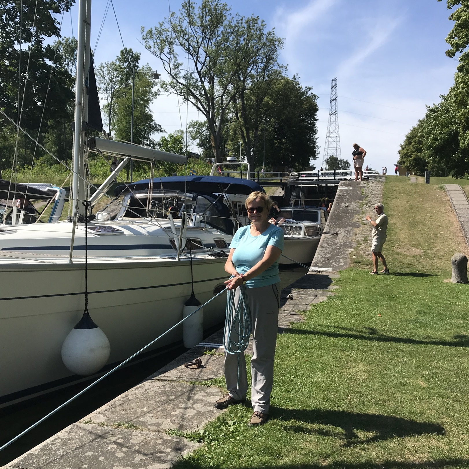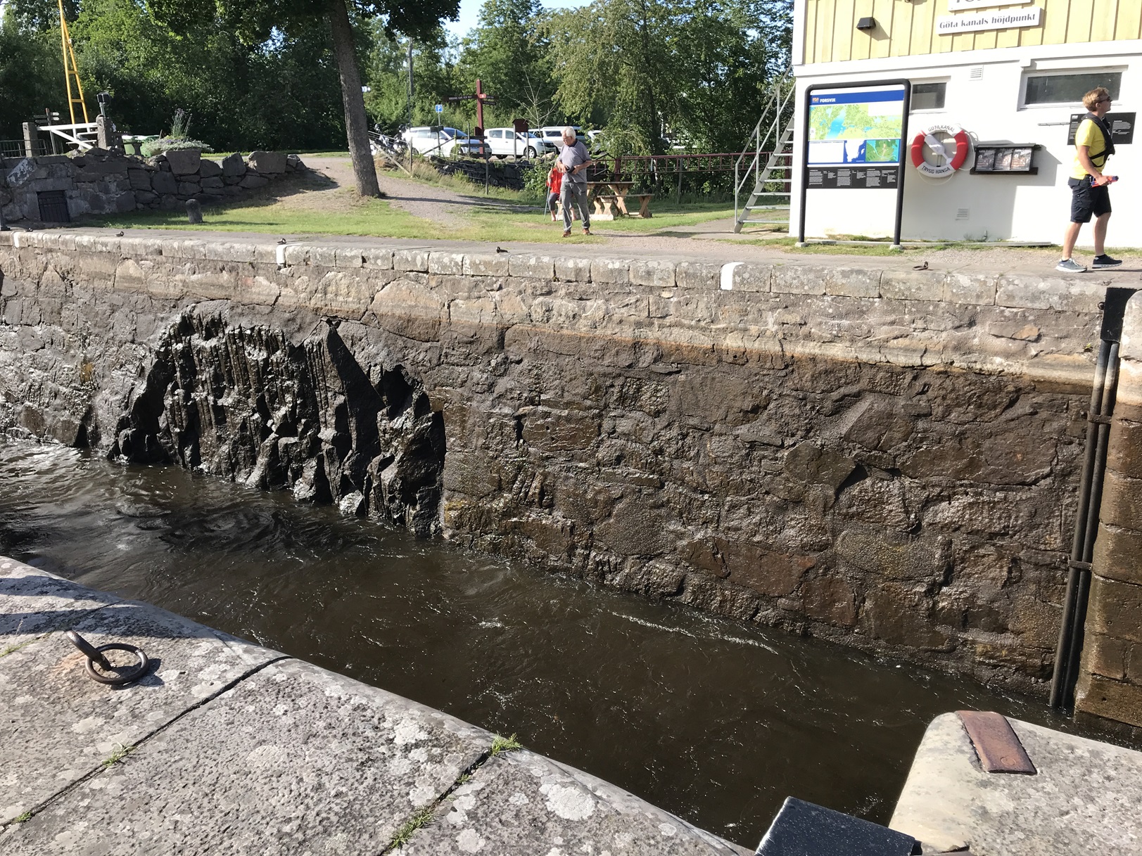 Die Schweden haben da ein besonderes System. Ein Crewmitglied (also meine Smutje) wird vor der Schleuse an einem kleinen Steg abgesetzt, geht mit der Vor- und der Achterleine an Land und folgt dem Boot. Wenn sich die Leinen nicht zwischen Fenderbrett und Fendern verdudeln (was natürlich passiert ist) fährt man entspannt in die Schleuse bis nach vorne. Die Crew legt die Achterleine über einen Ring, sodass sie senkrecht zur Achterklampe führt. Die Vorleine wird weit vor dem Bug ebenfalls über einen Ring gelegt. Danach hat die Crew Pause und der Skipper Stress. Der muss die Vorleine bei aufsteigendem Boot straff halten. Bei turbulenter Strömung kann das Kraft erfordern, deshalb wird die Leine über die Winch gelegt.