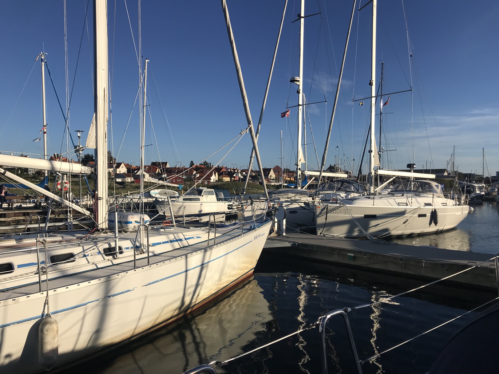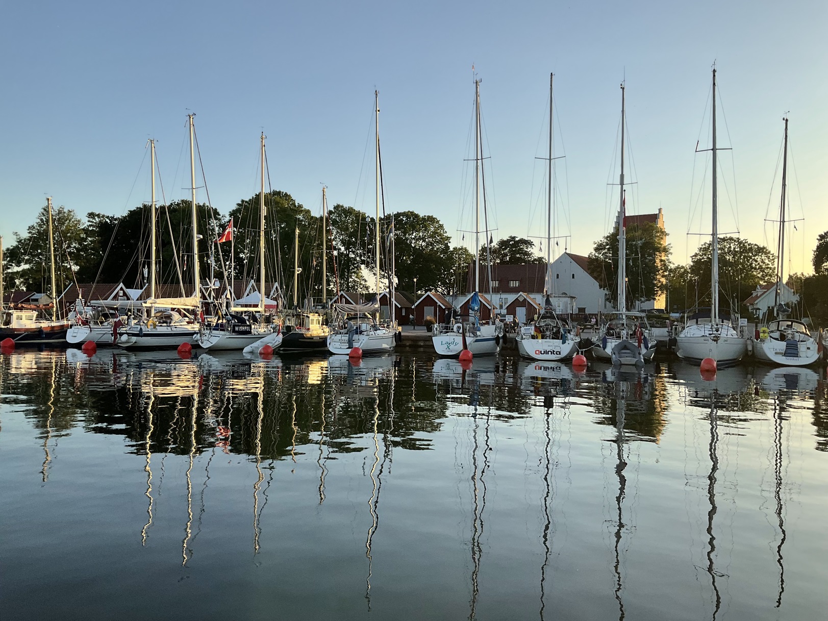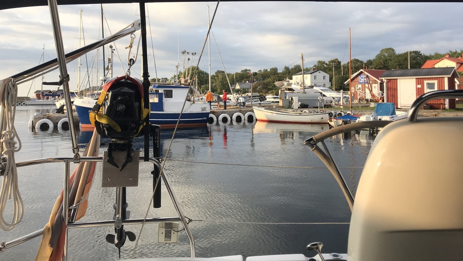 Weiter ging es am 14.8. nach Hanö. Eine hübsche kleine Insel mit einem ebenso hübschen kleinen Hafen.Am Morgen sind wir früh aufgebrochen, um die Morgenbrise zu nutzen. Beim Ablegen gab es eine unerwartete Schwierigkeit. Wir lagen an einer Heckboje zum Steg. Nachts hatte sich ein Schwede neben uns gelegt und, da keine Tonne frei war, mit dem Mooringseil an unserer Heckklampe fest gemacht. Normalerweise kein Problem, aber wir wollten ja früh los und wir wollten ihn nicht wecken (es war 5:30Uhr).