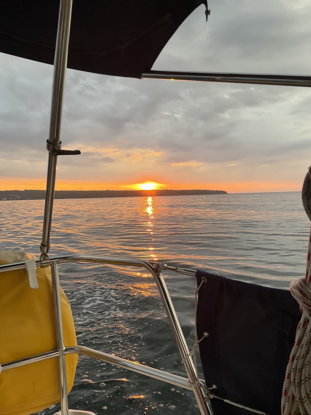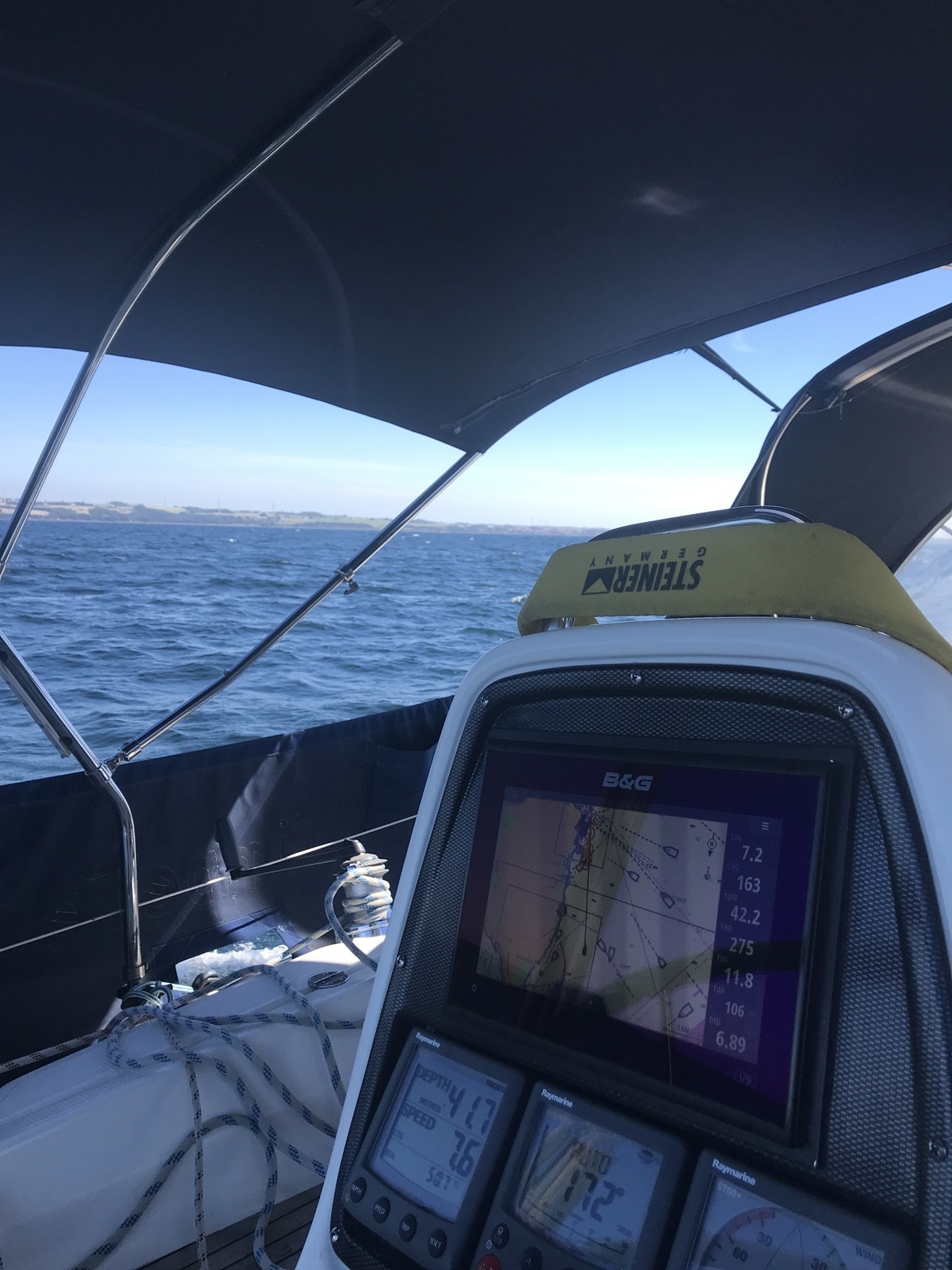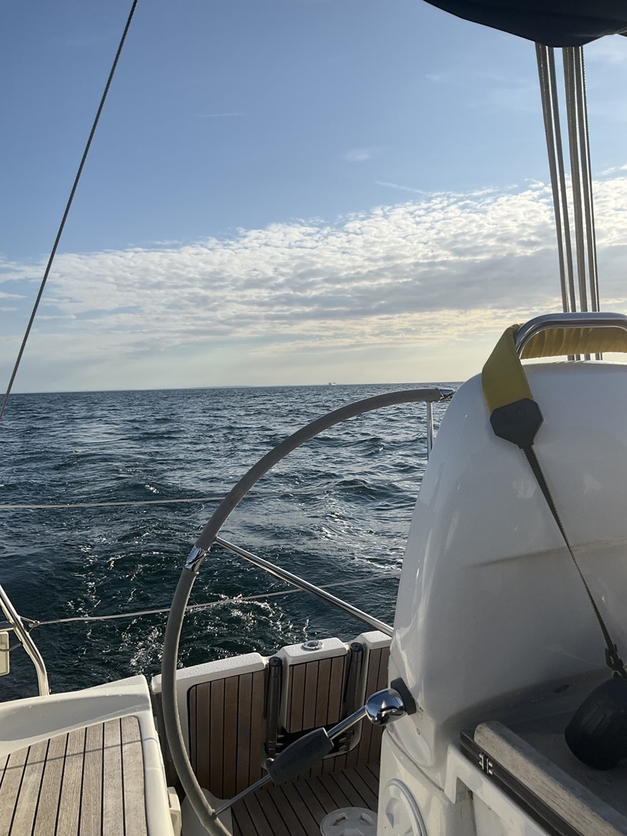 Also habe ich die Leine an unserer Klampe gelöst und nach Ziehen und Zerren an der Heckklampe seines Bootes festgemacht. War nicht so einfach aber hat schließlich geklappt.