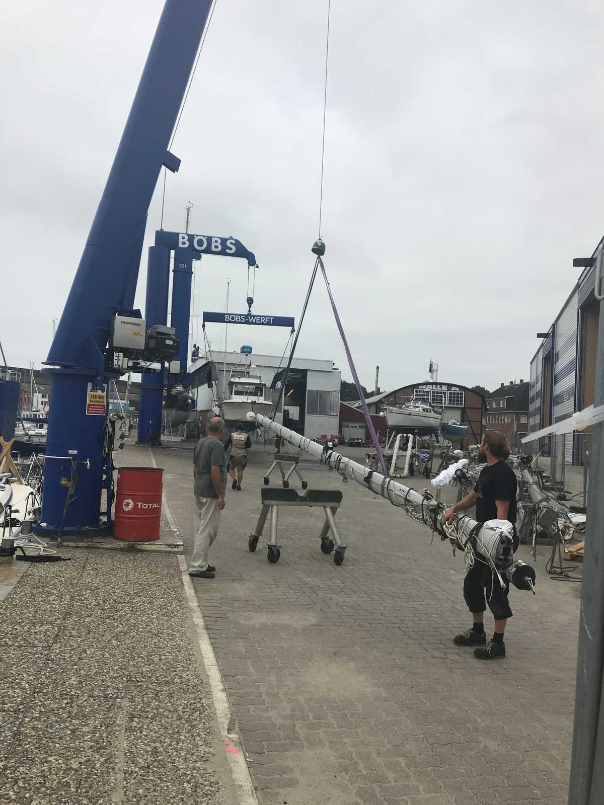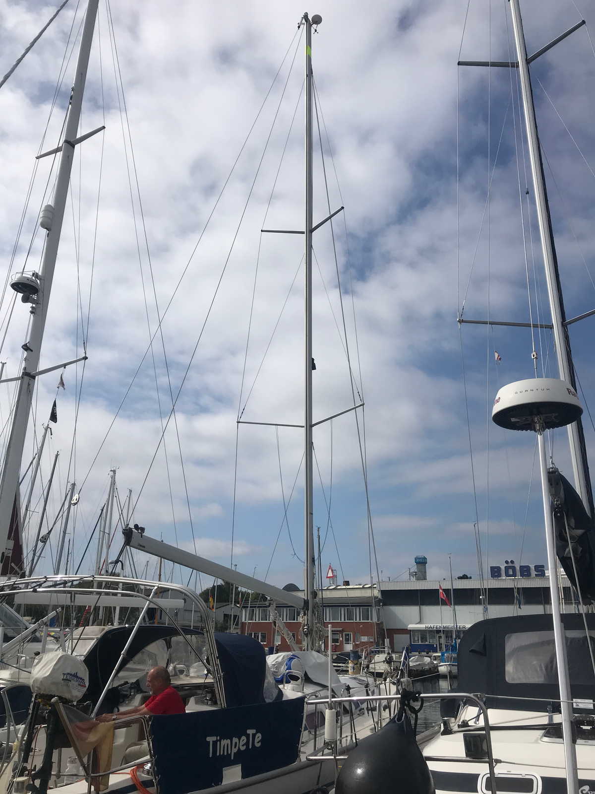 Die Marina Böbs-Werft war unsere nächste Etappe auf dem Weg nach Hause. Wir haben dort einen Termin für das Maststellen vereinbart und auch einen Liegeplatz bekommen. Die Marina und die Werft kann ich nur wärmstens empfehlen. Die Hafenmeisterin sehr nett, der Liegeplatz ruhig und Strom / Wasser / Duschen im Preis enthalten.