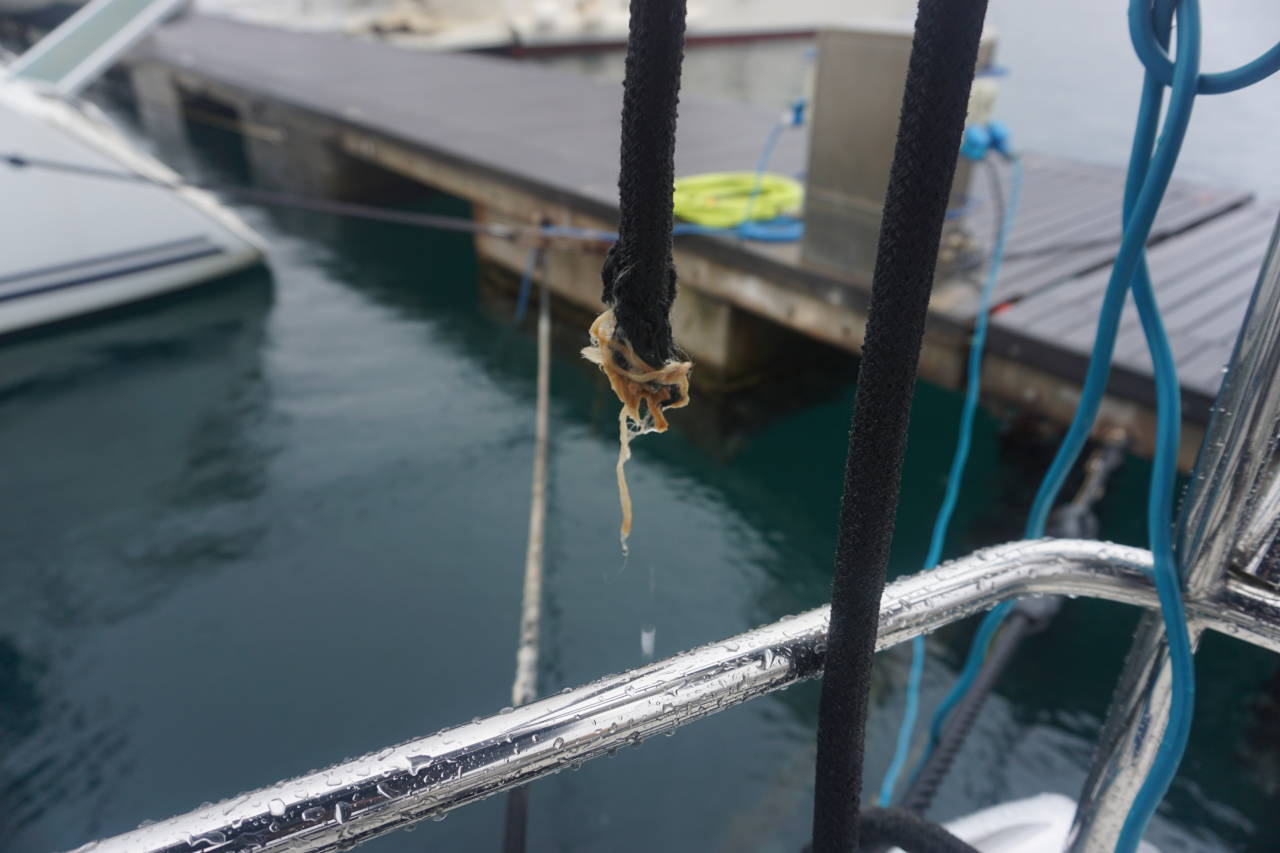 Eine bange Frage bleibt noch: Wie sieht das Unterwasserschiff aus? Bei 16°C Wassertemperatur ist Tauchen kein Spaß. Aber es wird mir wohl nicht erspart bleiben. Die Mooringseile sehen jedenfalls nicht vertrauenserweckend aus.